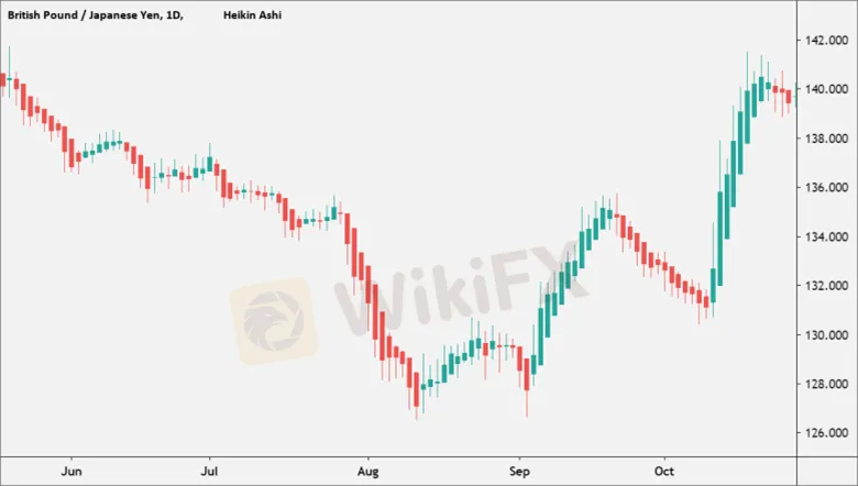 使用传统的日本烛台图,每个烛台代表价格在当前时间段内的开盘价,最高价,最低价和收盘价。使用平均k线图烛台图表,每个烛台不仅包含当前时间段内的价格波动,还包括过去的价格信息。让我们看看平均k线图烛台是如何计算的,并一次迈出一步,首先,让我们绘制一张GBP / JPY的平均k线图图表以用作参考: