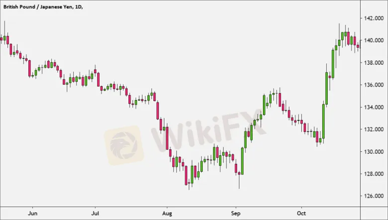 让我们了解一下平均k线图与传统日本烛台图表之间的区别。一张图片值一千点,所以让我们看一些实际图表。首先,这是传统的每日GBP / JPY图表: