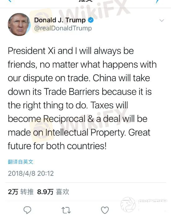 北京时间8日晚上,推特大王特朗普突然发了一条推特:“习和我将永远是朋友,无论我们的贸易争端如何。中国将取消贸易壁垒,因为这是正确的做法。税收将会变成互惠的,中美将会在知识产权上达成协议。两国都会有伟大未来!”
