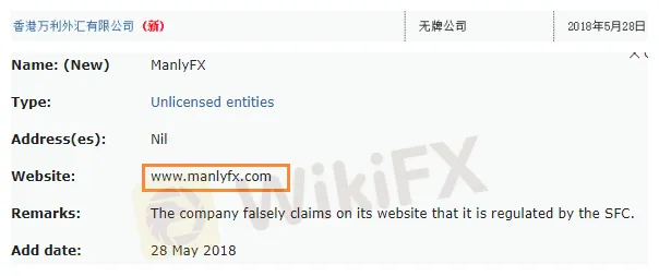 香港证监会SFC今日提醒投资者,警惕名为ManlyFX(香港万利外汇有限公司)的平台。
