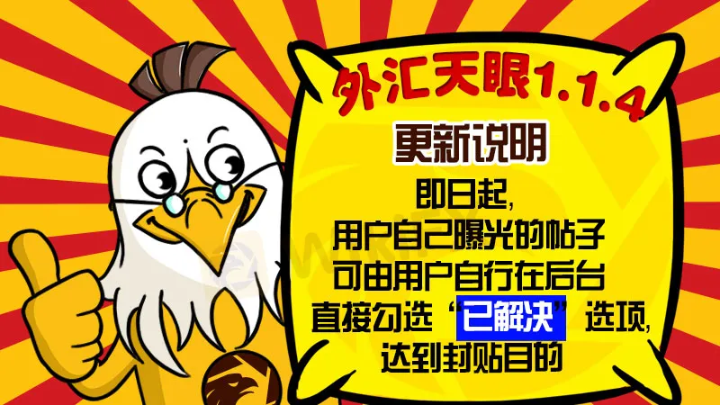 随着曝光台案件数量越来越多,外汇天眼深入了解每起案件所需的人力、物理成本也在不断增加。经天眼团队高层反复商讨,平衡各方利益,最终决定:即日起,用户自己曝光的帖子,可由用户自行在后台直接勾选“已解决”选项,达到封贴目的。