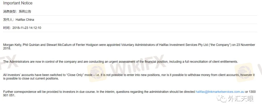 11月23日,Halifax突然发布通知,冻结当前全部账户,不允许进行出入金操作。而根据其监管信息显示,目前Halifax已进入破产流程。事发突然,投资者一时间不知所措,只能等待最终处理结果。