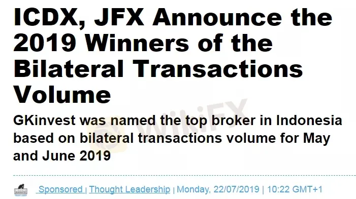 据2019年5月印度尼西亚商品及衍生品交易所(ICDX)和雅加达期货交易所(JFX)提供的数据显示,GK集团旗下品牌公司GKInvest成为当地五月份交易量最大的外汇经纪商,双边交易量107,134标准手,相较去年业绩增长高达20倍。