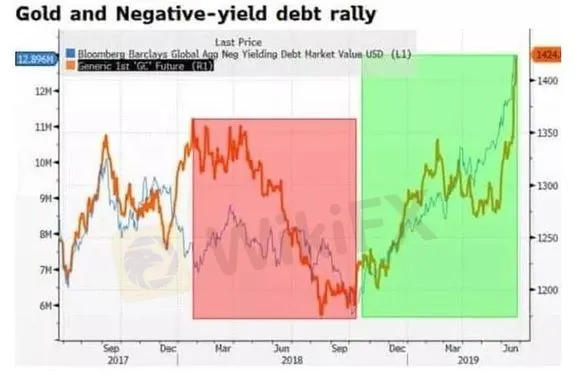 从下图可看出,负收益率债券规模上升是金价走高的重要因素,二者之间存在强烈的正相关性。