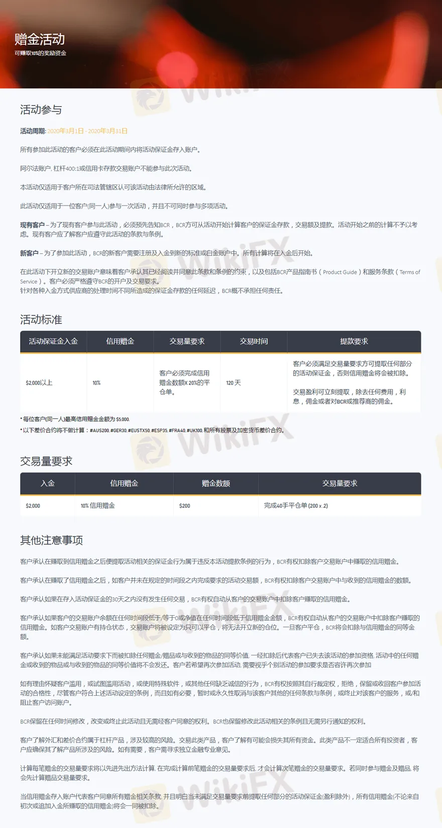 澳洲百汇BCR:10%赠金活动。 为了现有客户参与此活动,必须预先告知BCR,BCR方可从活动开始计算客户的保证金存款,交易额及提款。活动开始之前的计算不予以考虑。现有客户应了解客户应遵守此活动的条款与条例。