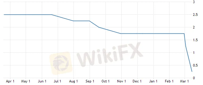 (美联储3月份连续降息两次至0%-0.25%)