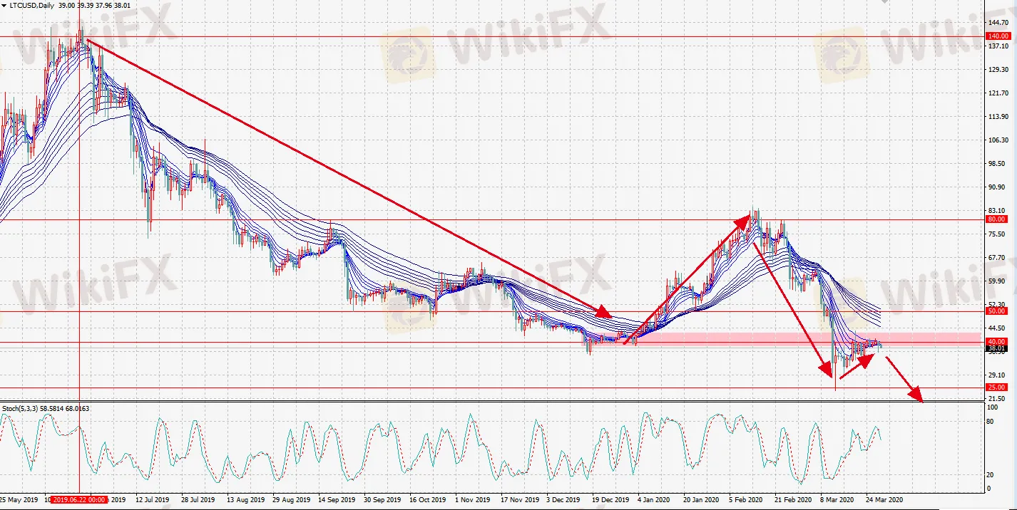 日线图级别,自2019年中以来的中长期空头趋势依然占据主导地位,40附近受顾比均线短期组缠绕压制,也是去年底密集成交区,在3月12日被大阴线击穿后,支撑转化为新的阻力,因此40附近是一个较好的做空区域。