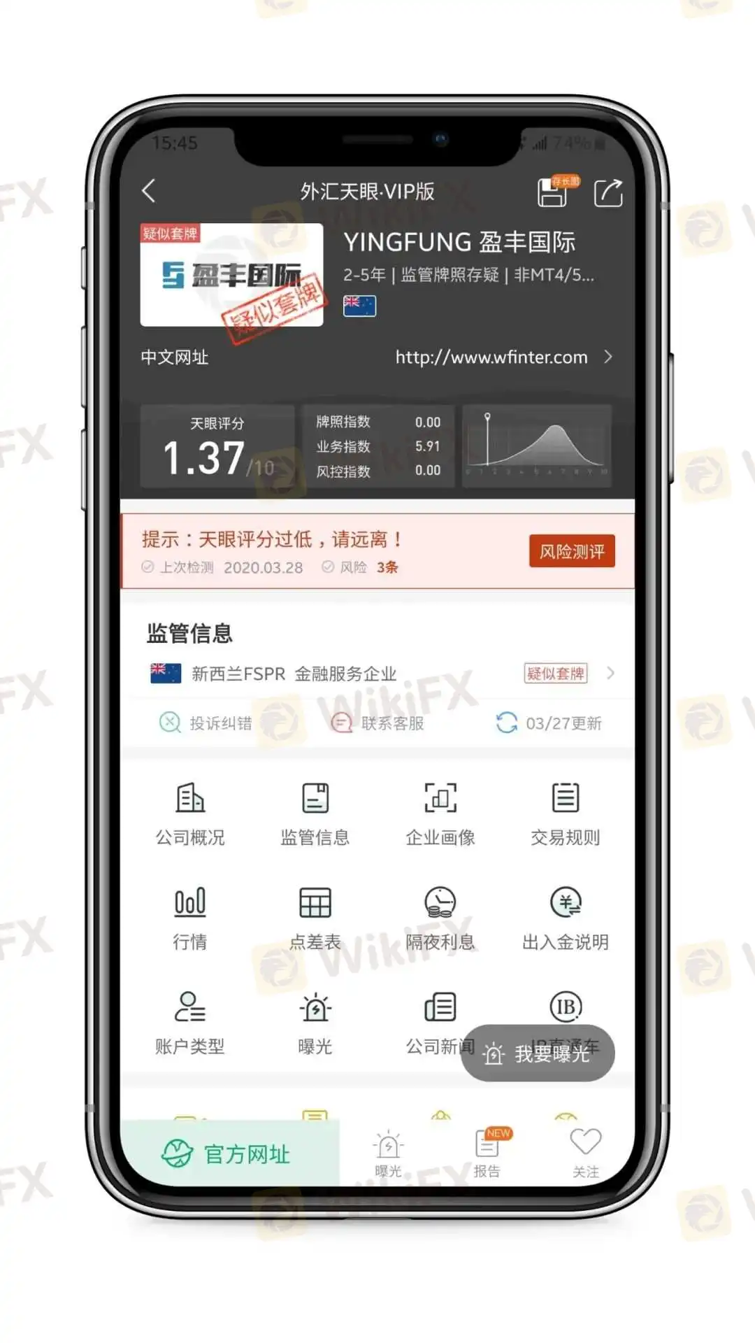 YINGFUNG盈丰国际,天眼评分1.37分,其宣称所持牌照疑似套牌,且该交易商使用的交易软件为非MT4/5软件,该类软件安全性存疑,存在巨大风险,建议远离!