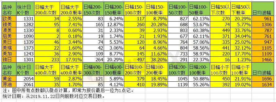 不同的品种,日均波幅大小不同,出现大的波动的概率也不同,这就需要小波动的产品用较大手数和较小止损,而大的波动的产品用较小手数和较大止损。如下图,我们做了一个简单统计,供参考。