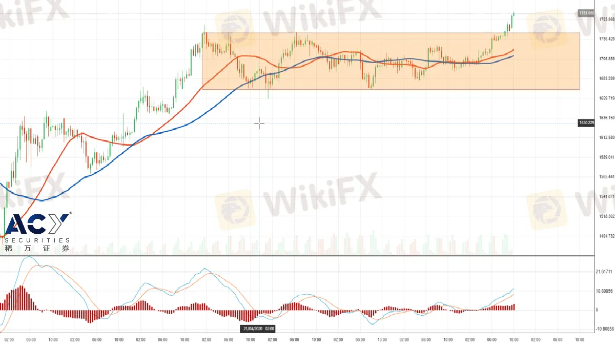 4月初至今,金价长时间陷入1675-1730区间宽幅震荡,疫情好转和股市回升一度极大的削弱了黄金的上行动力,但经济回暖和前景的不确定性也使得金价在一个月的时间内维持在高位运行。技术面金价上周五盘尾突破逐渐收敛的三角形形态,隔周开盘后更是刷新此前4月14日高点,跟进买入的多单持续入场,目前4小时图表中行情连续收出实体较大的光头光脚阳线,MA30均线向上击穿MA60均线,短线冲高的走势料将持续一段时间。从三角形破位提供的上行动能来讲,接下来金价有望上涨至1780一线,若市场出现新的风险,则金价可能借机对1800关口进行试探。