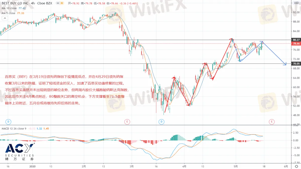 纵观电商股亚马逊、沃尔玛都在4月20号后期出现明显的调整,而体量更轻反弹力度更强的百思买,虽然并未出现明显的破位走势,但两周内股价大幅跑输纳斯达克指数,侧面印证了电商股的强势周期告一段落,市场或经历修整后有望再度反弹。因此后市关注4月高点附近,80整数关口的高空机会,下方支撑看至71.5盘整箱体上沿附近,五月份或将维持先抑后扬的走势。