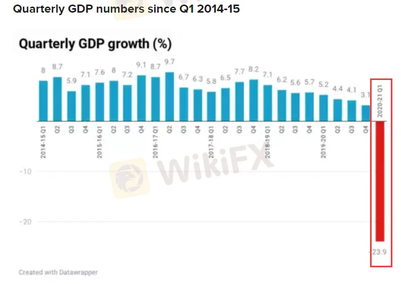 据印度政府8月31日公布的数据,2020年二季度(4月至6月)印度国内生产总值同比下降23.9%,创下40多年来最大滑坡。印度媒体称,此为1996年印度开始公布季度经济数据以来,降幅最大的一次,也意味着印度成为亚洲主要经济体中经济下滑最为严重的一个。