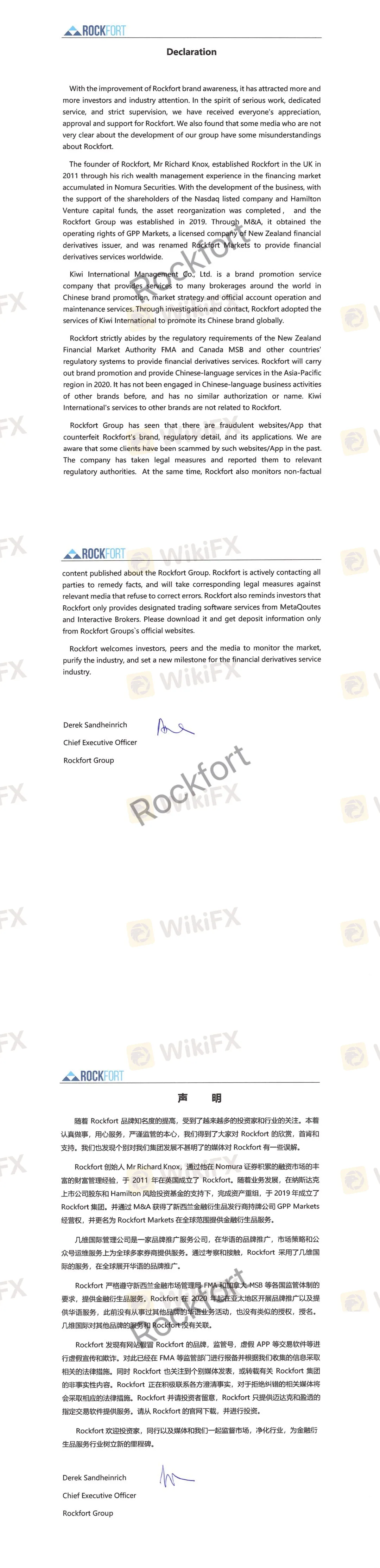 Rockfort 严格遵守新西兰金融市场管理局 FMA和加拿大 MSB等各国监管体制的要求,提供金融衍生品服务,Rockort在2020年起在亚太地区开展品牌推广以及提供华语服务,此前没有从事过其他品牌的华语业务活动,也没有类似的授权,授名。几维国际对其他品牌的服务和 Rockfort 没有关联。