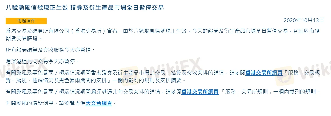 若八號或以上臺風信號/極端情況警告於中午12時或之前取消,香港交易所證券及衍生產品市場的產品將於下午恢復交易,並會在臺風信號/極端情況警告解除約兩小時後的整點或30分開始交易。