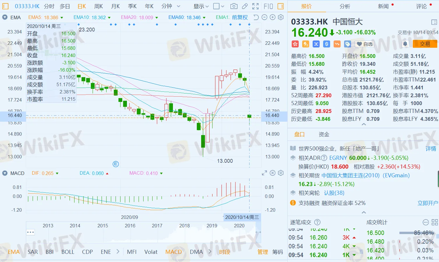 周三港股開盤後,中國恒大港股跌逾16%。昨日因八號風球休市壹天的港股總體表現疲軟,香港恒生指數周三開盤上漲0.65%,但隨後迅速走低。