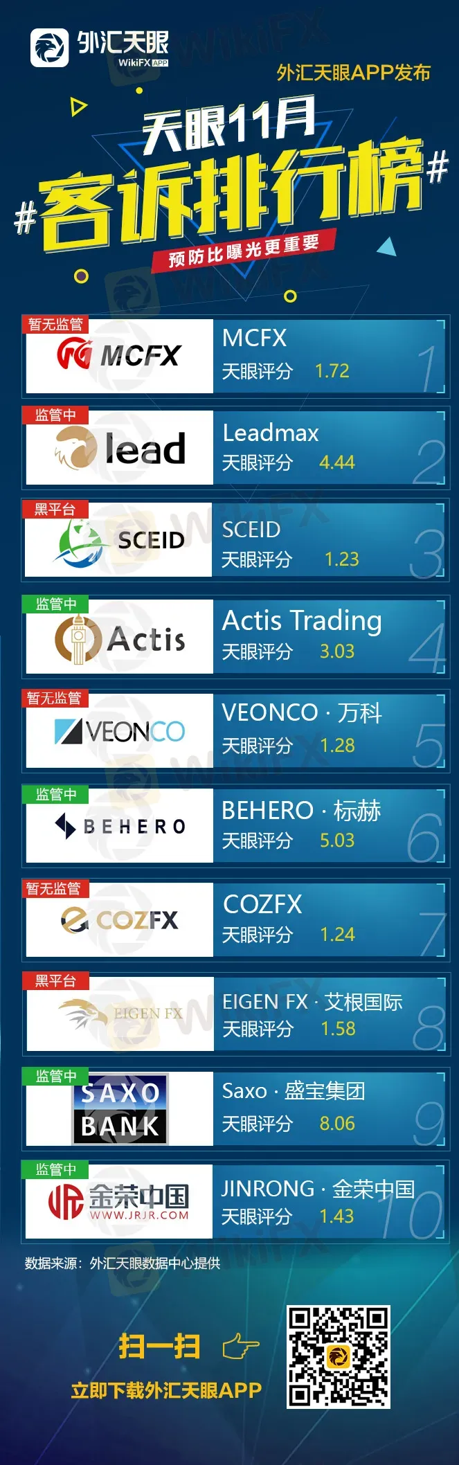MCFXLeadmaxSCEIDActis TradingVEONCO · 万科BEHERO·标赫COZFXEIGEN FX · 艾根国际Saxo · 盛宝集团JINRONG · 金荣中国看完榜单,是不是觉得前四名的平台如此熟悉,在本榜单公布之前,外汇天眼就曾经曝光了4家平台存在“裙带关系”。 相关曝光文章如下: 1. 黑平台MCFX、ACTIS、资金盘SCEID再现“同款公告模板”,难道师出同门? 2. 黑平台leadmax疑似清场重开盘,小心下一个被骗的就是你! 在当时的曝光中,我们就提到黑平台MCFX、ACTIS与资金盘SDEID同一天出现无法出金的状况,且在当天发布了类似的公告。这样的“巧合”,就真的不算巧合了!很明显,三家平台存在联系,亦或是背后的公司是同一个。而leadmax是ACTIS的相关白标,也在此时出现了同样的问题,答案显而易见。 MCFX、ACTIS、SDEID、leadmax