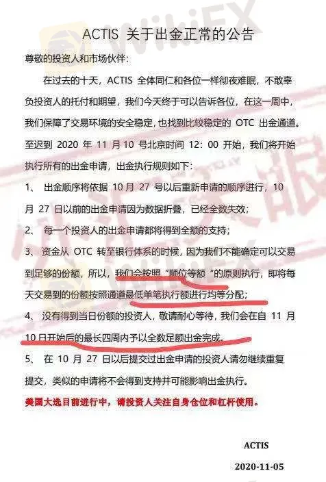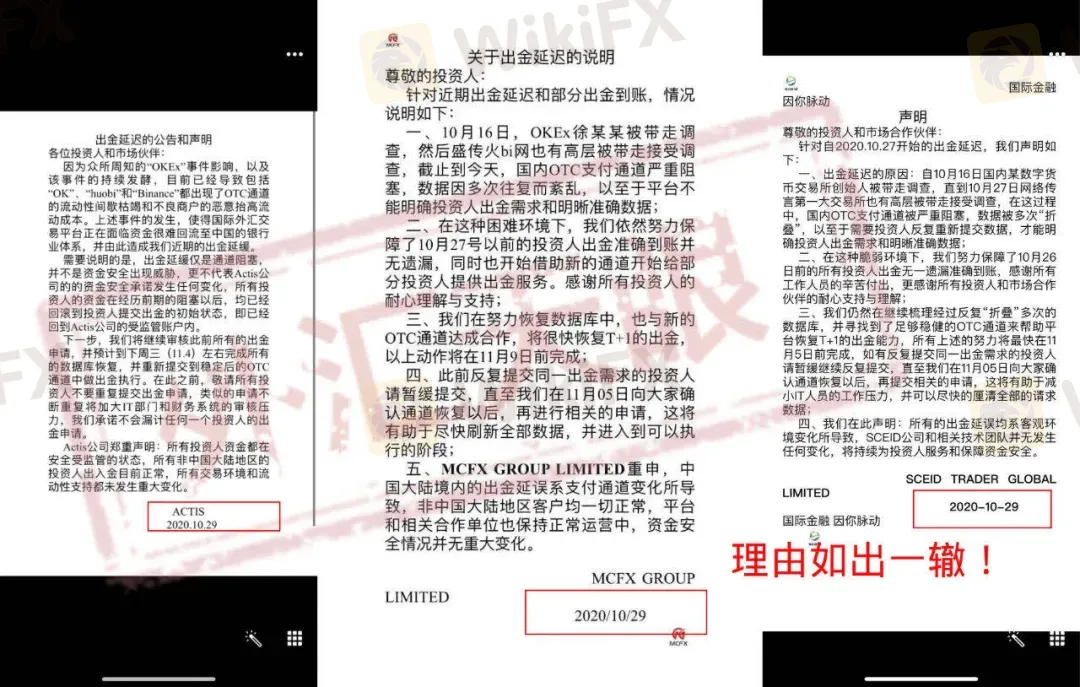 今年9月底,MCFX、ACTIS、SCEID三家平台同时发布了“关于出金延迟说明”的公告,公告内容几乎是一模一样,不同的仅仅是平台logo及名称。这些公告无非是平台使出的拖延政策,直到等到11月初的最后通牒时间,三家平台依旧没有出金,平台的投资者们才恍然大悟,但是为时已晚,现在三家平台已经全部沦陷,相关负责人已经跑路。