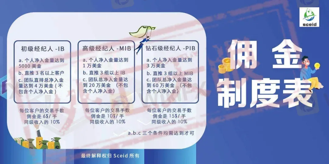 其中SCEID属于资金盘模式,在曝光的平台PPT中,其资金盘的特点显露无疑,该平台拥有详细的佣金制度表,丰厚的经纪人奖励制度也导致了SCEID的受害者剧增。