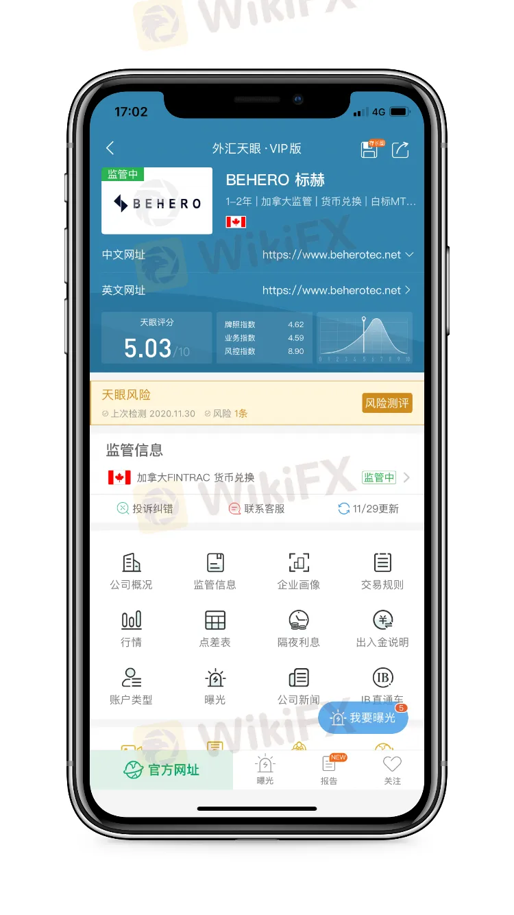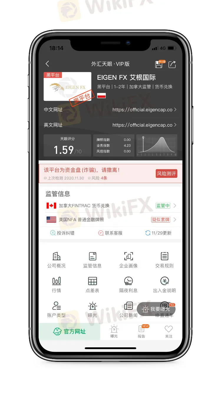 外汇天眼上查询可知,BEHERO·标赫 天眼评分5.03分,宣称持有的加拿大FINTRAC货币兑换牌照仍在监管中但没有实际有效的监管力度,曝光台中已经出现多则无法出金的客诉。 在11月底,BEHERO·标赫陆陆续续出现了无法的出金的问题,相信跑路问题是近期发生的,建议标赫的投资者尽快撤离,该平台即将跑路。 EIGEN FX · 艾根国际