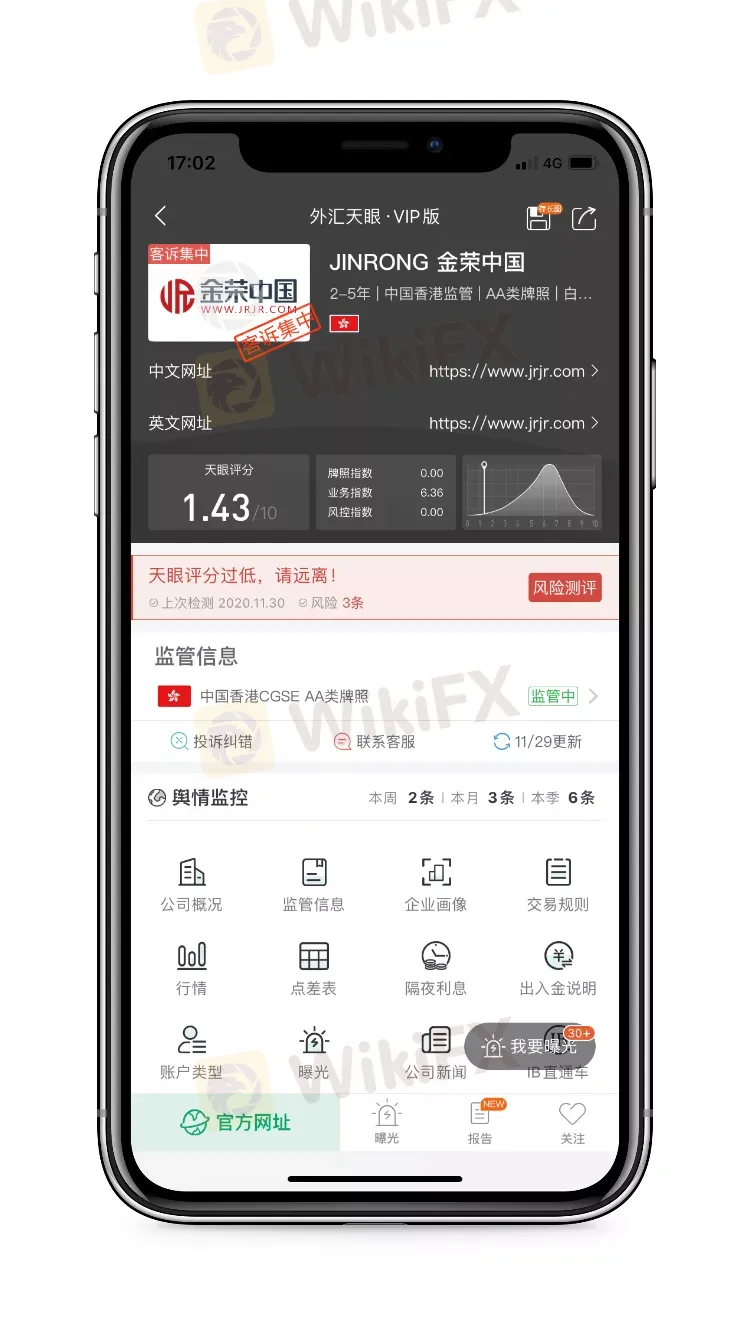 外汇天眼上查询可知,Saxo · 盛宝集团 天眼评分8.06分,宣称持有的牌照多数都在监管中,只是法国BDF、阿联酋DFSA以及澳大利亚ASIC授权的牌照或是超限经营或是已撤销,曝光台中也出现了多则客诉,建议投资者注意警惕。 这类的大平台经常有被黑平台冒充的可能,被欺瞒的投资者没有判断出真假平台的区别从而对大平台进行申诉。 有关此类骗局,外汇天眼的12月刊杂志里面有详细介绍,感兴趣的读者可以前往购买阅读,一元包邮即可获得。 虽然的确存在很多冒充盛宝集团的黑平台,但是真真假假很多投资者包括小编也是无法判断,在此,只能提醒外汇交易者们在平台交易时一定要擦亮眼睛,注意甄别。 JINRONG · 金荣中国