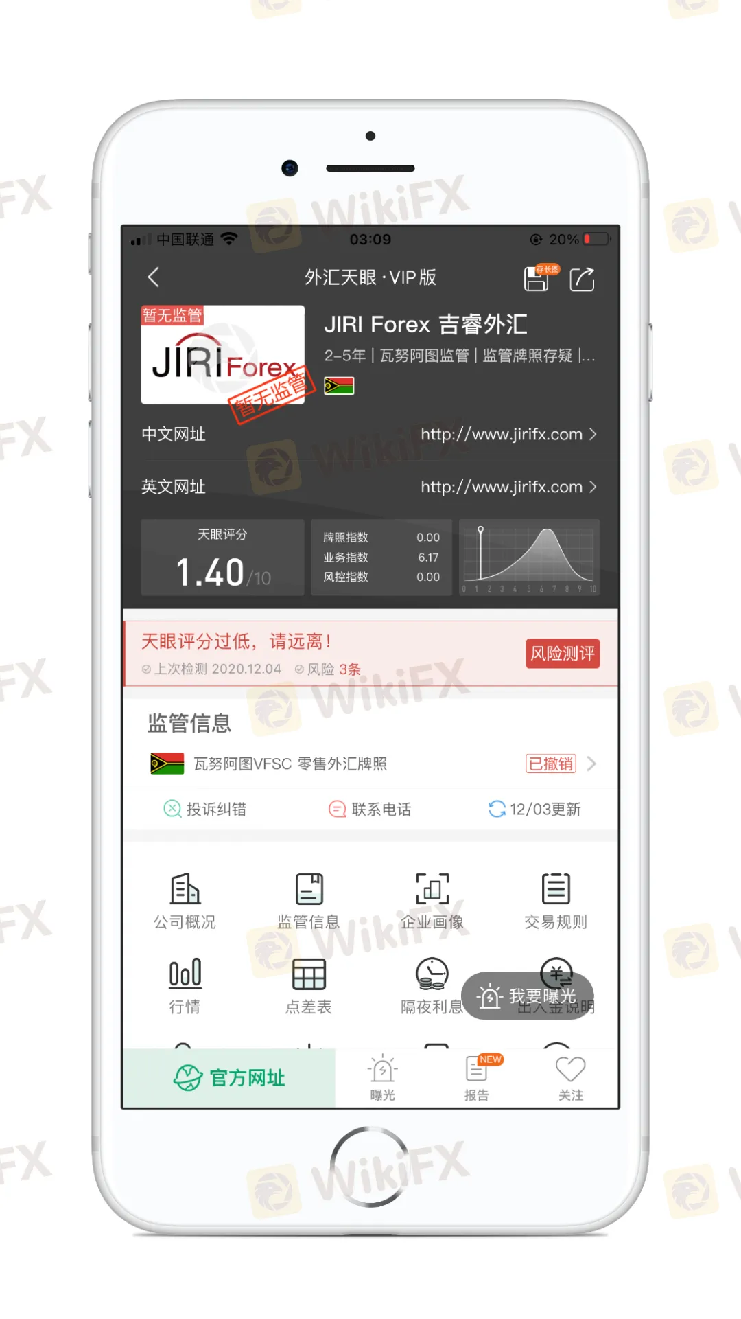 JIRI Forex 吉睿外汇,天眼评分1.40分,所持牌照被撤销后,当前暂无任何实际有效监管,存在巨大风险,建议远离。