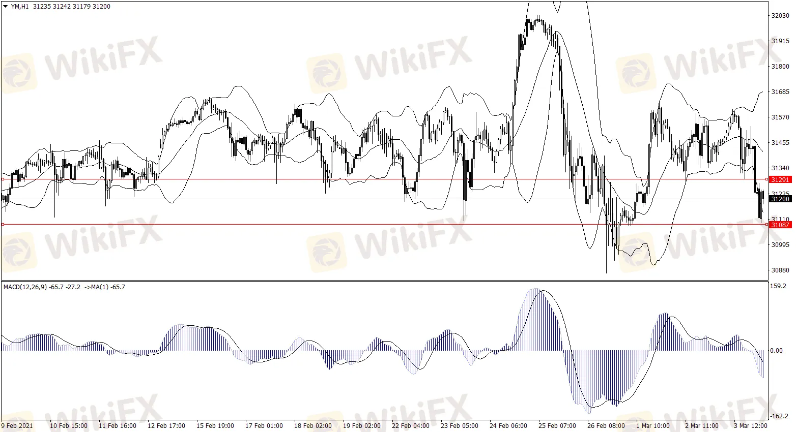 道指短线跌破31300后加速下跌,目前31300成为第一压力,支撑在31100,30840.指标看布林线开口加大,MACD持续下跌,似乎下跌动能依旧存在。策略上投资人可以尝试逢高空策略,升破31300离场。