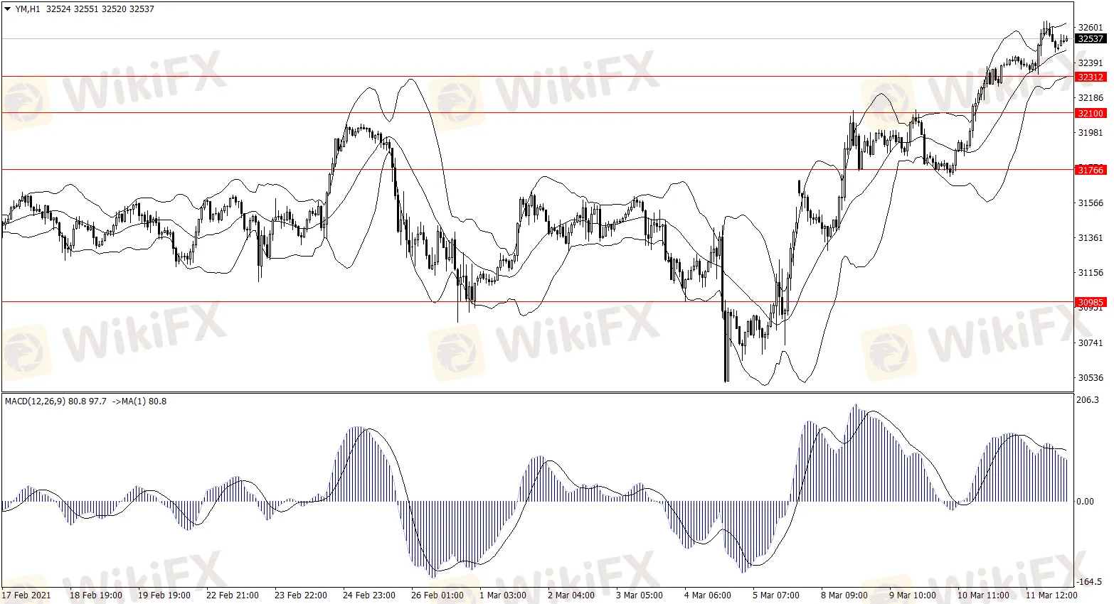 道指目前形态超强,下方第一支撑是布林线下轨位置32300附近,破位看32100附近,上方压力是32700附近。指标看布林线开口向上,而MACD指标高位横盘,但似乎略显高位背离。交易策略上投资人避免高位追多,尝试支撑位置逢低介入多头,跌破支撑多头离场。