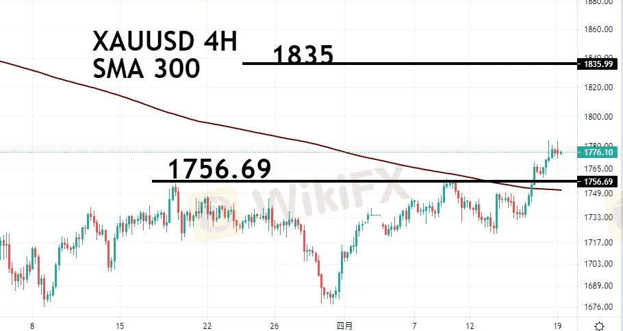 在上周CPI数据公布后,本走回零轴附近的实际利率再度呈现负值深化,使黄金突破颈线1760以及均线压力的两大关键位置,并急奔至目前1776。