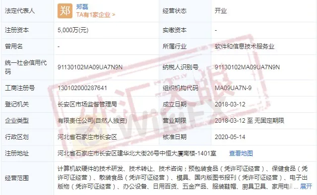 通过查询可知,河北紫府信息科技有限公司成立于2018年3月12日,法人代表为郑磊,注册资本5000万人民币。