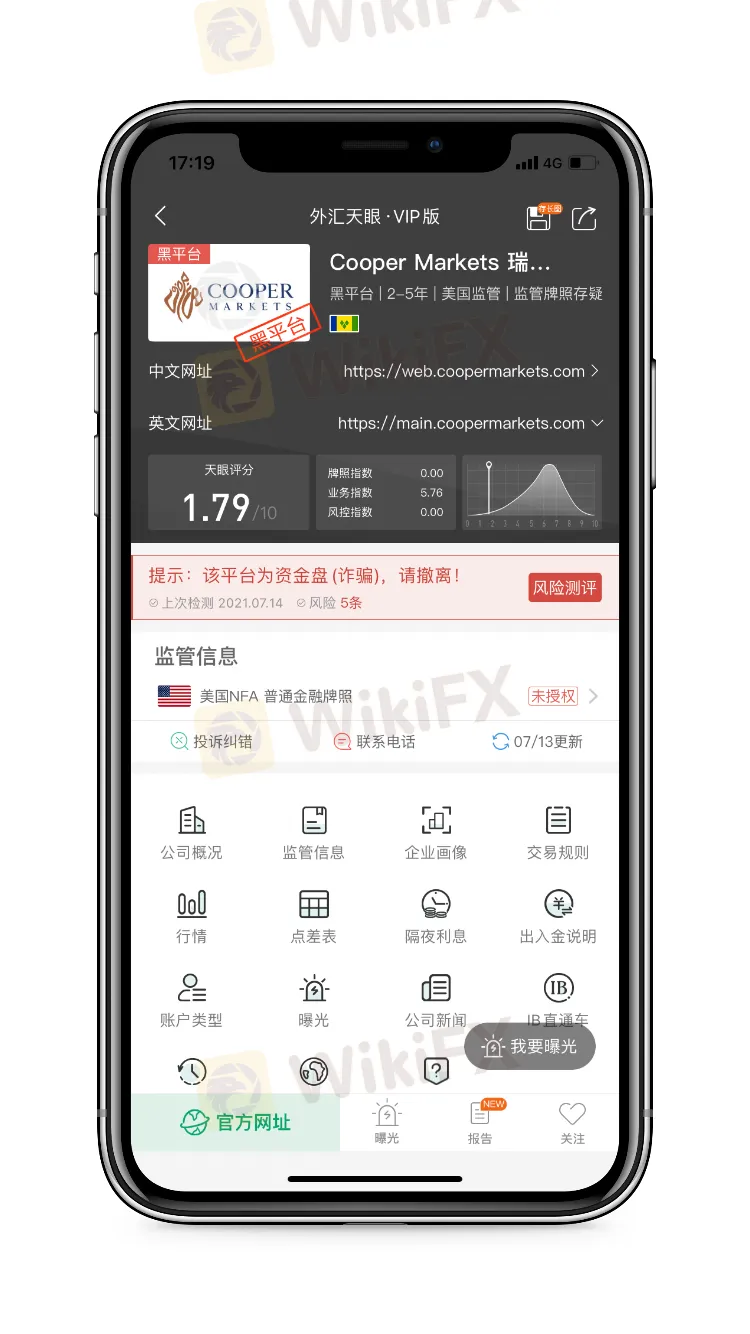 在外汇天眼中查询Cooper Maekets(又称瑞丰证券、CP Markets),天眼评分1.79分,所宣称持有的美国NFA牌照监管状态异常为“未授权”,近3个月内,天眼已经收到对该平台的投诉曝光达65条,经证实该平台为资金盘诈骗,存在巨大风险。