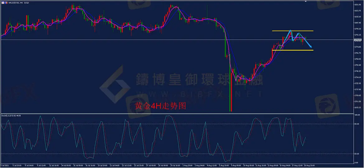 黄金4小时周期上,价格上行连续测试1800不破,止步于当前压力位附近,有回落或调整的需求。4H线上,价格高位震荡于1790附近,上边界1795,下边界1770一线,而均线开始轻微拐头向下,显示市场重心有所回落,价格有测试下边界的可能。操作上,可在压力位附近考虑操做空单,防守放于区间压力位之上,价格下行方面关注1780心理关口及1770的支撑位。