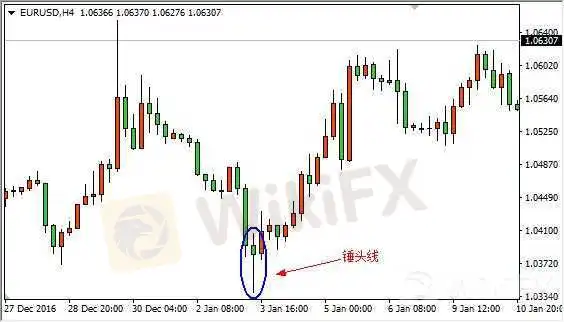 锤头线一般出现在下跌途中,阳线(亦可以是阴线)实体很小,下影线大于等于实体的两倍,一般无上影线,少数会略有一点上影线。