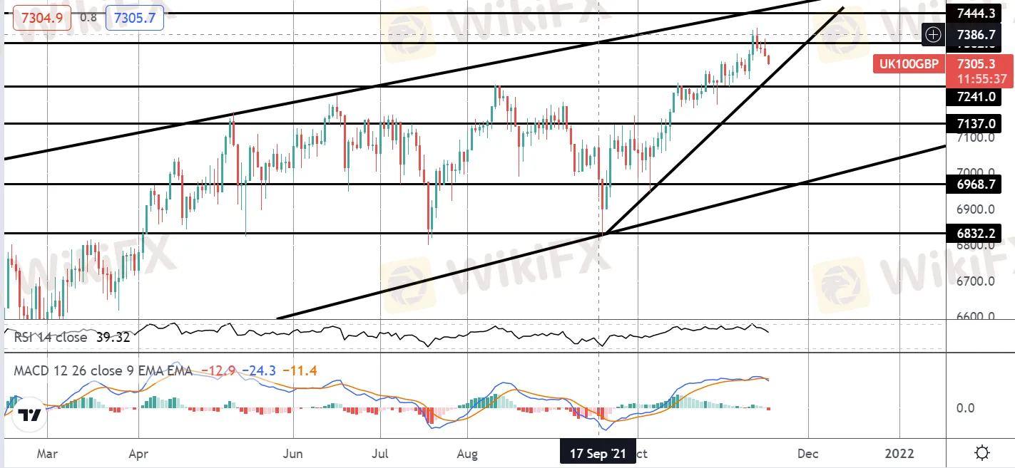 英镑升值和英国央行将收紧的预期显然是英国资产价格的阻力。富时指数目前正从高于7362.6点的水平上向下修正,MACD已转为负值,RSI指向下方。关键的观察区域是当地的上升趋势线和7241水平。这里的突破将是一个坚定的熊市发展,下一步将焦点转向7137的测试。