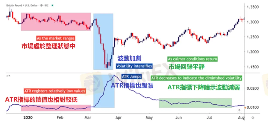 在价格走势图表添加ATR指标之后可以发现,价格变动越大,ATR指标的值就越大,如下图所示: