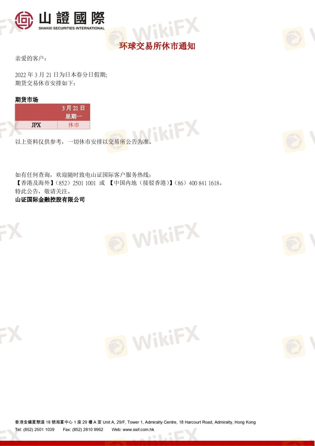 山证国际|环球交易所休市通知