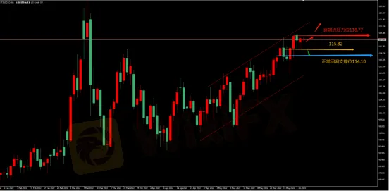 技术上,油价周二盘中波动幅度在2.6%多,不过日线级别继续位于三月高位,技术上仍维持在强劲上行通道内,日内整体依旧维持在高位的震荡区间内,盘中回落试探了115.82重要价位的支撑性。但是需要注意的是美油日线级别出现了明显的上行衰竭结构表现,118.77价位就是衰竭点,因此美油存在一定回落需求。