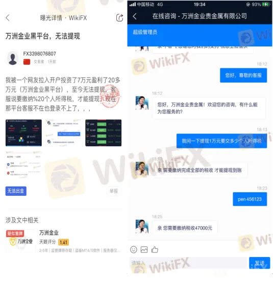 一位网友表示自己被拉入万洲金业开户投资了7万元,而在盈利了20多万元后至今无法提现。究其原因平台客服声称需要缴纳20%的个人所得税才能提现,该网友称该平台客服目前已经已经联系不上也登录不了。