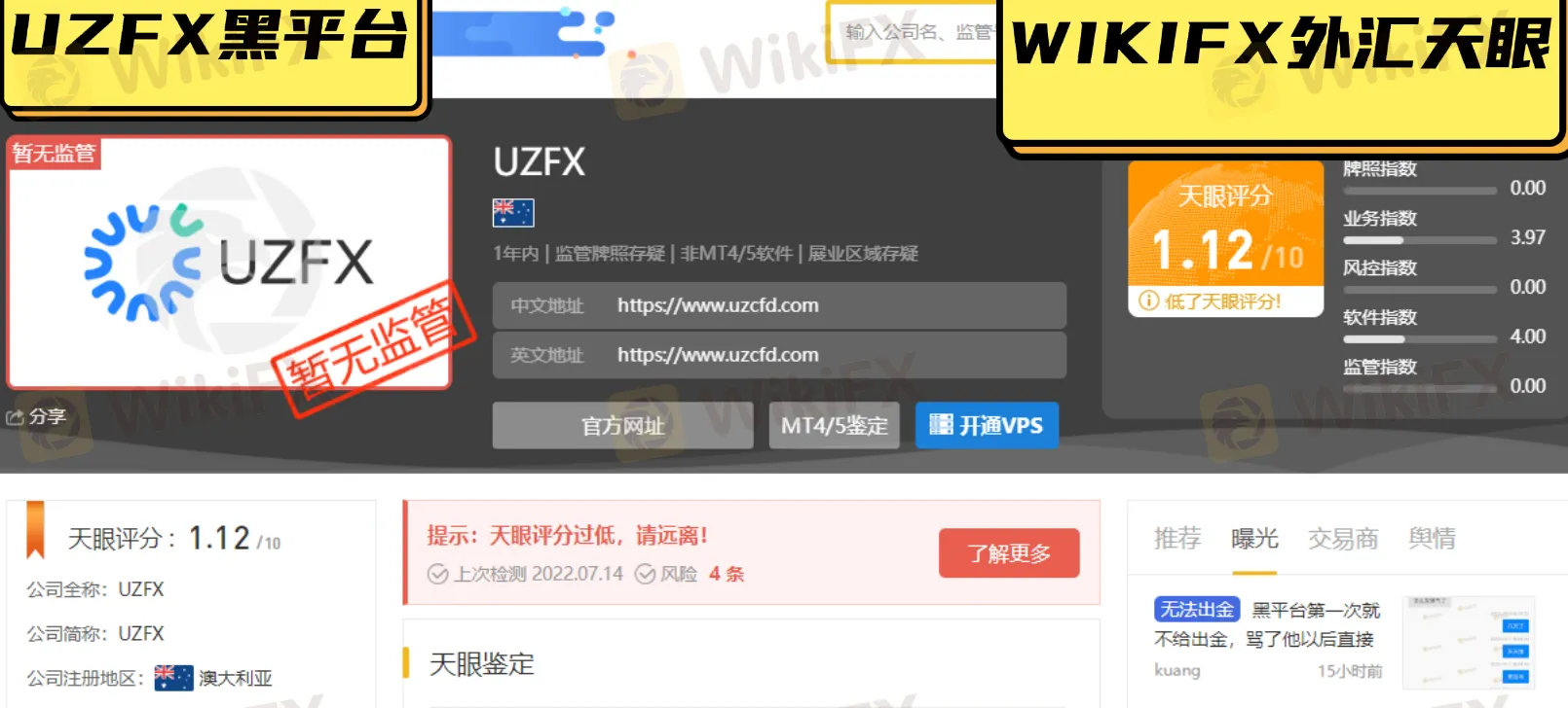 正所谓“投资千万条,出金第一条,平台不规范,被骗两行泪。”外汇天眼也在此提醒投资者在做外汇交易之前,一定要审核清楚外汇平台的资质以及官网信息,以防上当受骗。