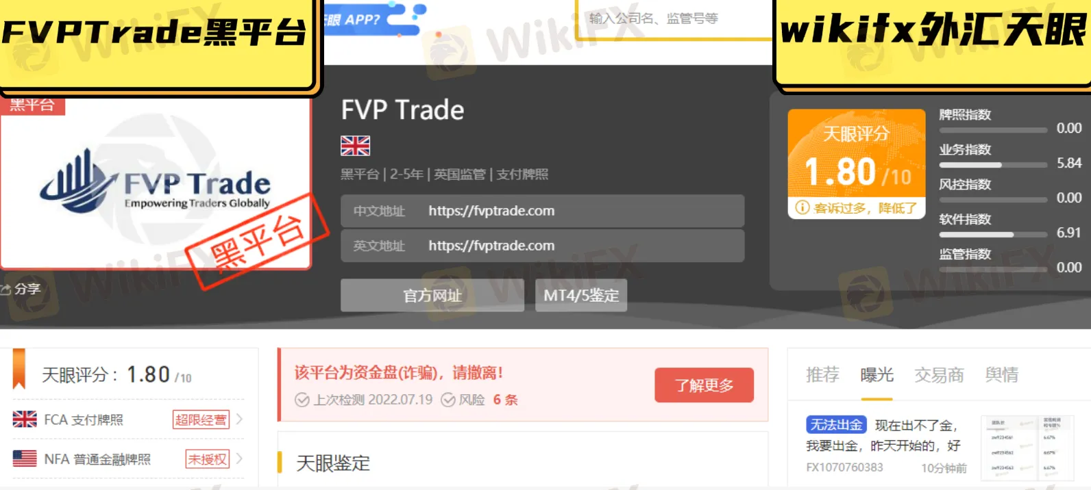 摘要:近日外汇天眼收到多起FVP Trade平台的投诉,称其无法出金疑似跑路。受害者表示FVP具体情况不知道为什么,现在已无法出金,有自己加朋友的50万美金在里面出不来,求外汇天眼解决方法,同时还有朋友提出这样的疑问,有监管拍照怎么资金还会被冻结无法出金呢?
