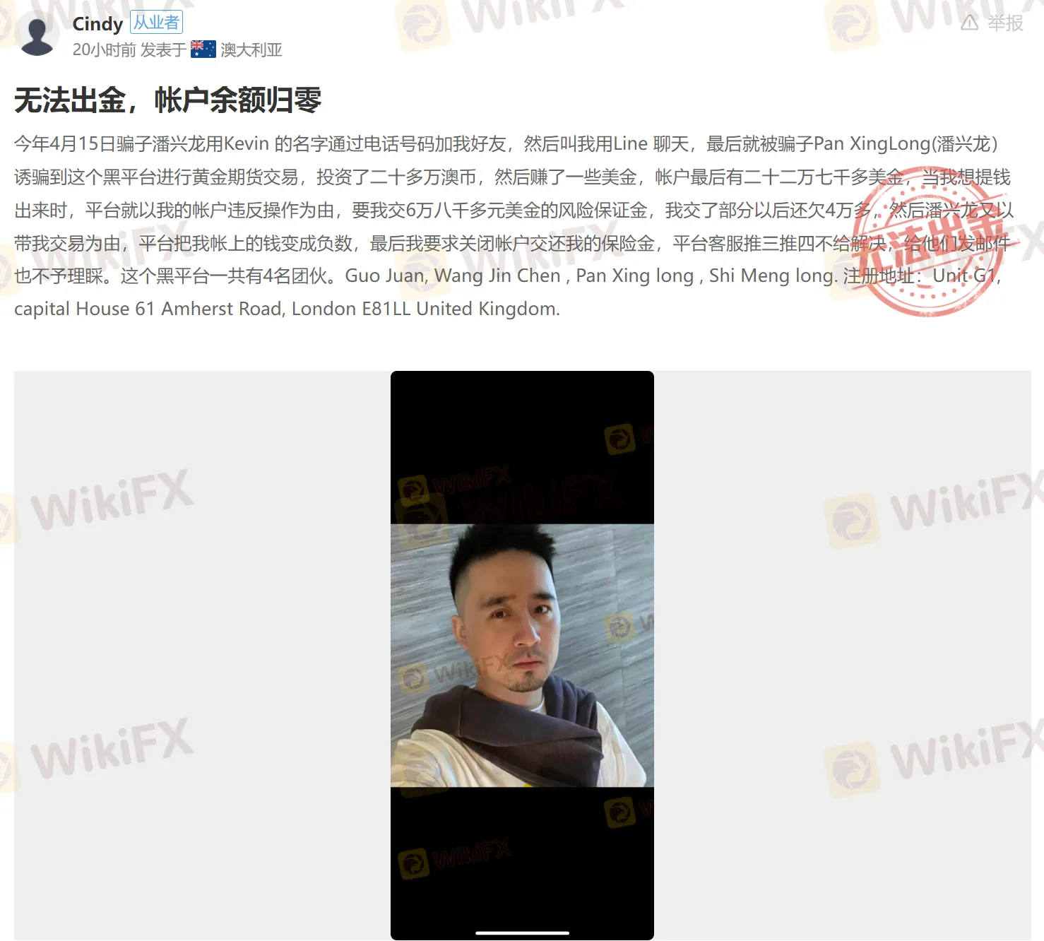 在不让其出金的背景下,然后潘兴龙又以带她交易为由,把她帐上的钱变成了负数,最后她要求关闭帐户退还自己缴纳的保险金,平台客服推三推四不给解决,给平台发邮件也不予理睬。Cindy爆料称据她了解,这个黑平台一共有4名团伙分别是Guo Juan, Wang Jin Chen , Pan Xing long , Shi Meng long. 注册地址:Unit G1, capital House 61 Amherst Road, London E81LL United Kingdom.