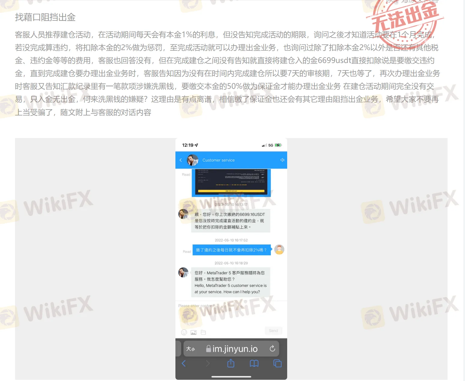 一位来自台湾的投资者向外汇天眼爆料, Bohua technology 客服人员谎称建仓活动期间每天有本金1%的利息,在1个月内完成不算违规,否则算违约,并以扣除本金的2%做为惩罚,完成活动即可办理出金业务,没有其他税金、违约金等费用。当该投资开始建仓后,Bohua technology 平台却以要缴交违约金为借口,既擅自扣除了6699美元转入资金,又暂停了出金业务,还告知其汇款纪录里有一笔款项涉嫌洗黑钱,需另外缴纳50%做为保证金。