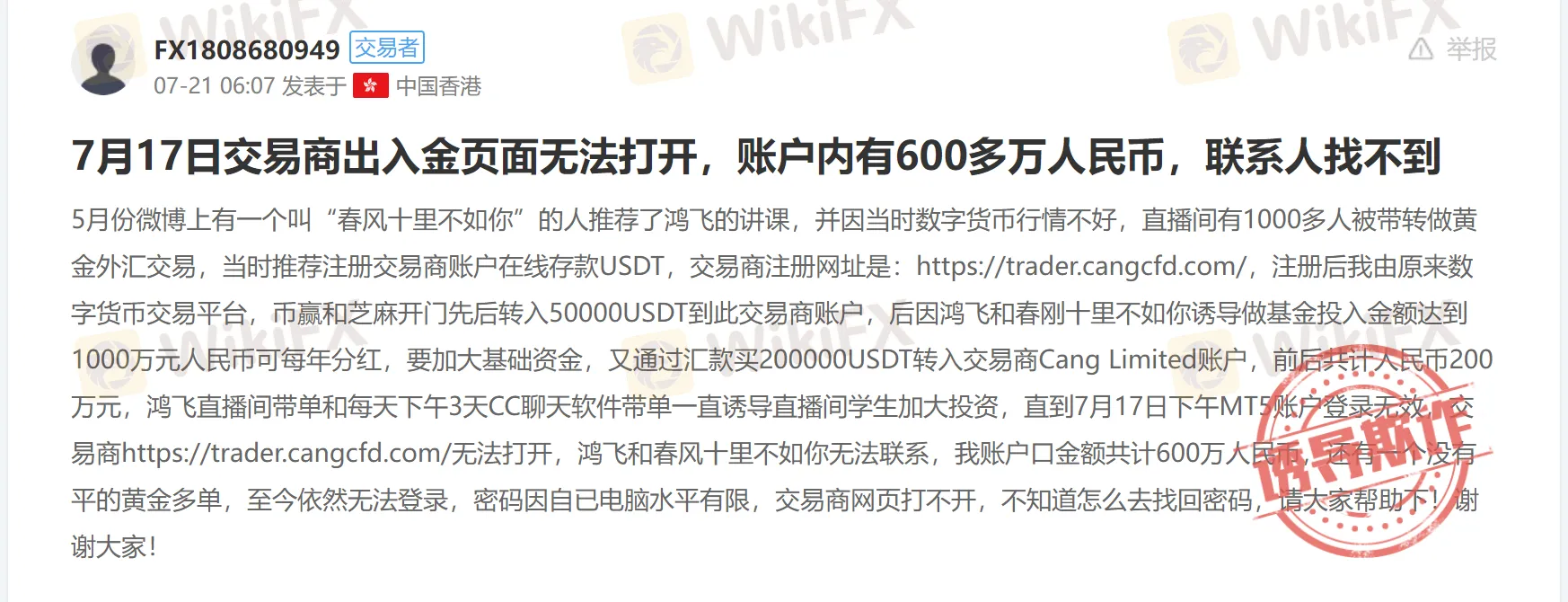 一位来自香港的用户向外汇天眼投诉,一个叫“春风十里不如你”的人于5月向他推荐了鸿飞的讲课,因数字货币行情不好,后在“鸿飞”及“春刚十里不如你”的诱导下,通过汇款买200000USDT转入交易商Cang Limited账户,并在其后向该账户累计入金达600余万元,结果他的资金账户无法登录,“鸿飞”和“春风十里不如你”也无法联系。