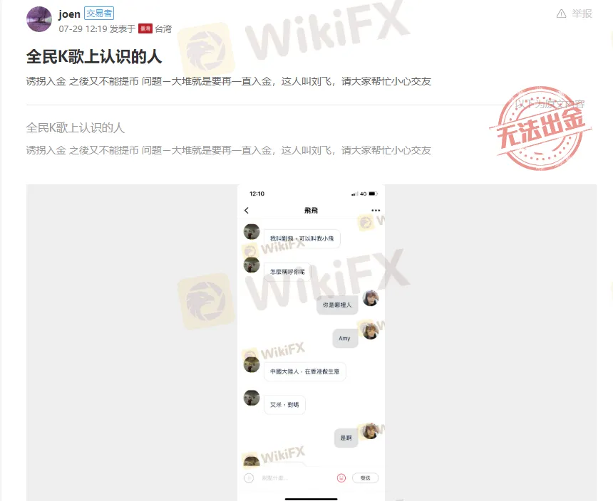 包括不少借助微博、微信、QQ 等社交软件,于投资者接触“熟络”后再步步引诱。作为大众休闲娱乐的重要方式,毫无疑问也被欺诈团队盯上成为投资理财骗局高发的地方。近日,外汇天眼就收到了一名投资者在全民K歌上被骗了。