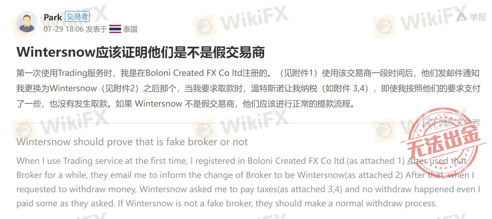 前不久,一位来自泰国的汇友向外汇天眼爆料,在开始进行外汇交易服务时,该汇友是在Boloni Created FX Co ltd平台注册并开设账户的,但使用该交易商一段时间后,汇友收到了来自Boloni Created FX Co ltd平台的邮件,称其改名为Wintersnow。然而,当这位汇友获利并准备提现时,平台则要求缴纳税费。出于急切出金的心理,这位汇友按照平台的要求支付了相应的税费。不过,令人遗憾的是,Wintersnow平台仍然无法出金。