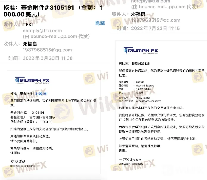 一名来自中国香港的邓福良表示,自己6月便向交易商 TriumphFX申请提现 13000美元,可到了7月,接近一个月时间段内平台仍然没有向自己汇款。7月底邓福良先生再次向交易商 TriumphFX发出提现 13000美元申请,目前又过了一个月时间,平台还是没有汇款。最后邓福良先生无奈的表示:“一直无法出金?我该怎么办?”