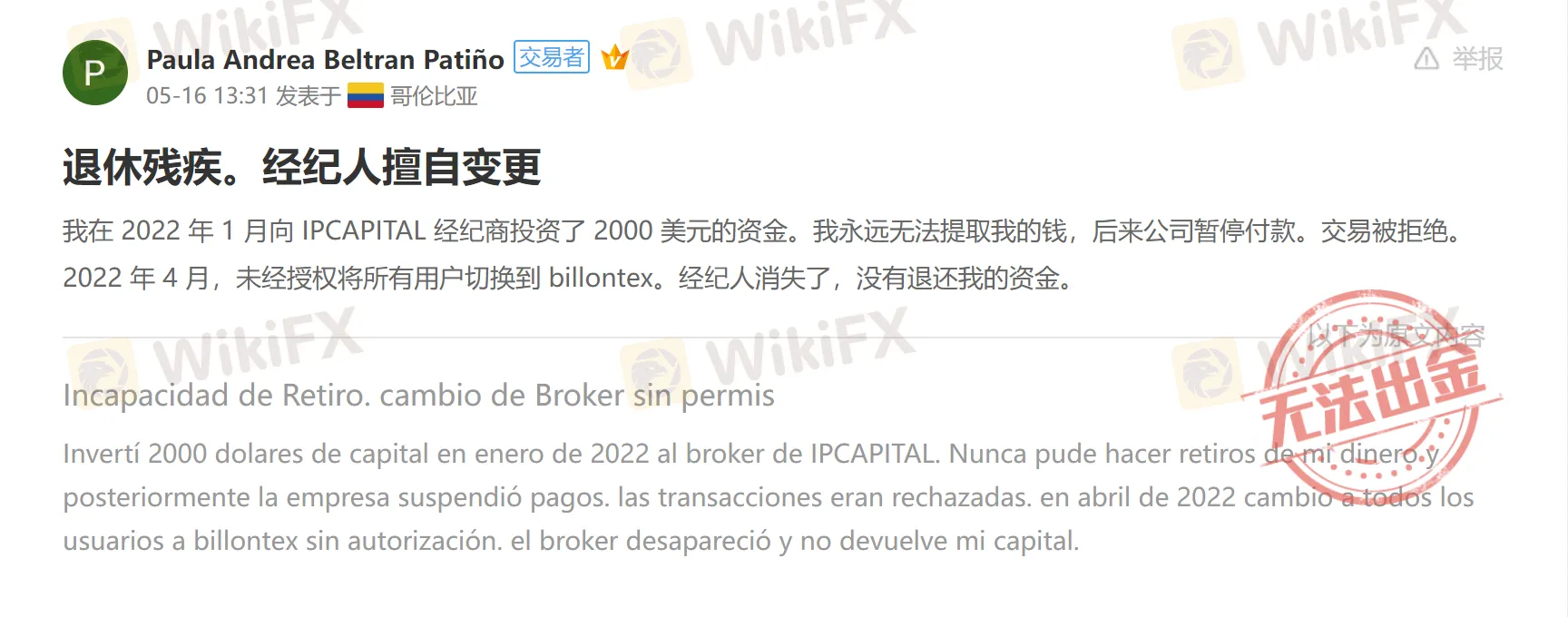 前段时间,一位来自哥伦比亚的退休残疾人士向外汇天眼爆料,受高收益广告的忽悠,于2022年1月在IPCAPITAL平台开通了资金账户,并向此账户转入了2000美元的资金进行外汇交易。然而,令该投资者始料未及的是,不久之后,IPCAPITAL不仅突然拒绝了用户的交易请求,还暂停了账户的提现流程。更为奇葩的是,这位投资者发现,2022年4月以后,未经其本人授权,原先平台的用户都被切换到了Billionext交易平台。从此,Billionext平台客服便杳无音讯,该投资者的出金也随之耽搁至今。