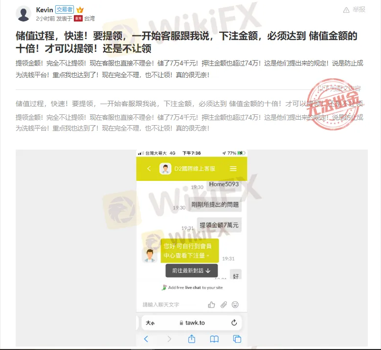 Kevin表示,想把自己在GAD 平台上账户内的资金提取出来,但是平台完全不让提领!最一开始客服给到的回应是为了防止成为洗钱平台,客户提现需要其账户交易金额必须达到其充值金额的10倍。