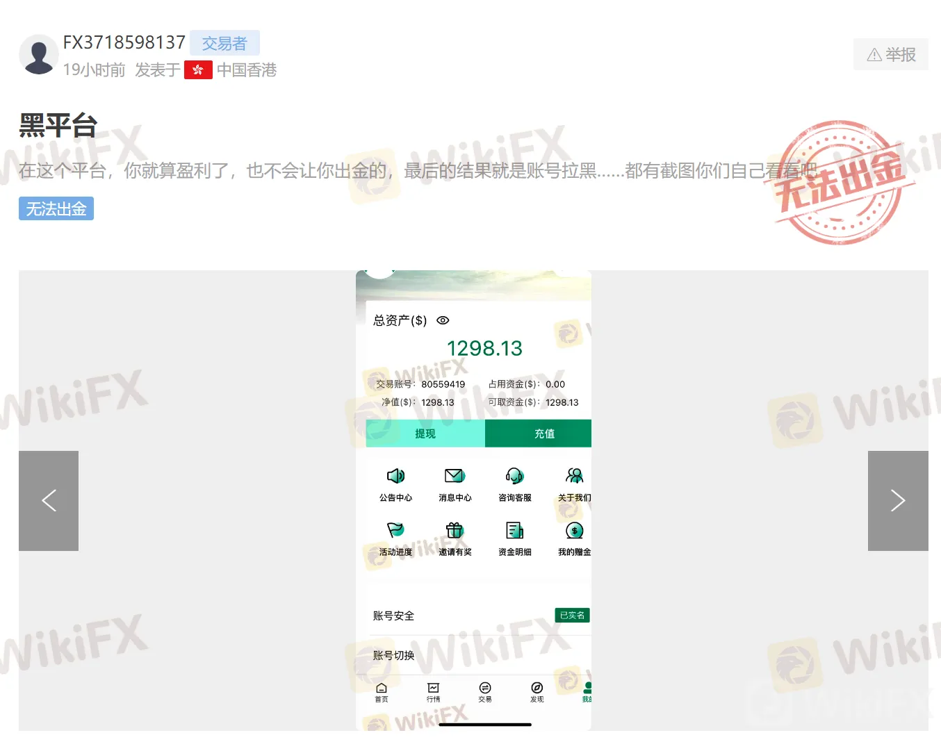 有用户在网上爆料在FinPros正当获利197 USD被平台死死卡住,说是在交易期间,平台侦测到有其他违规玩家打盘,所有盈利的人都不给出金。