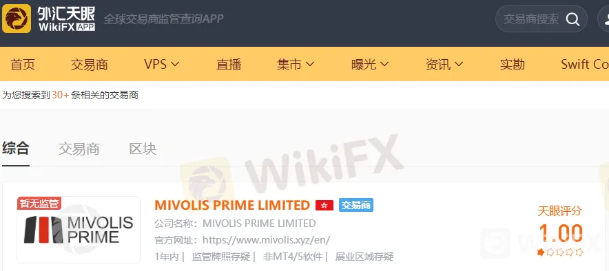 其实有很多方法可以避免出现这样的情况,在做外汇和其他交易之前,可以在我们外汇天眼上面先检索一下该平台是否可靠,就拿MIVOLIS PRIME LIMITED平台举例,在天眼首页搜索MIVOLIS PRIME LIMITED可以得出如下结果: