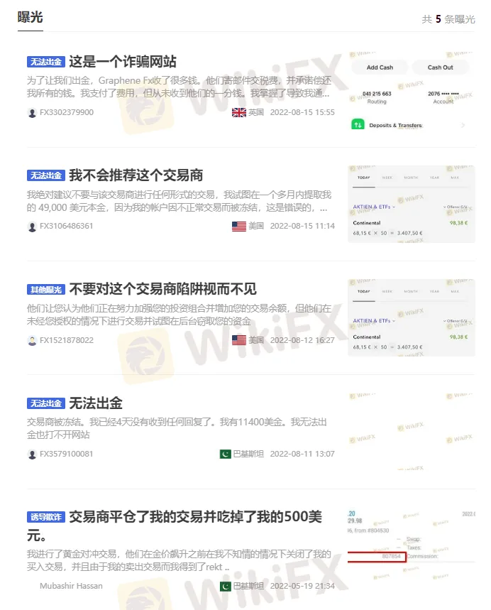 近期,有多位投资者曝光Graphene Fx无法出金,从受害者分布地区来看,目前已经有来自英国、美国和巴基斯坦的投资者在外汇天眼曝光区曝光自己的受害经历。